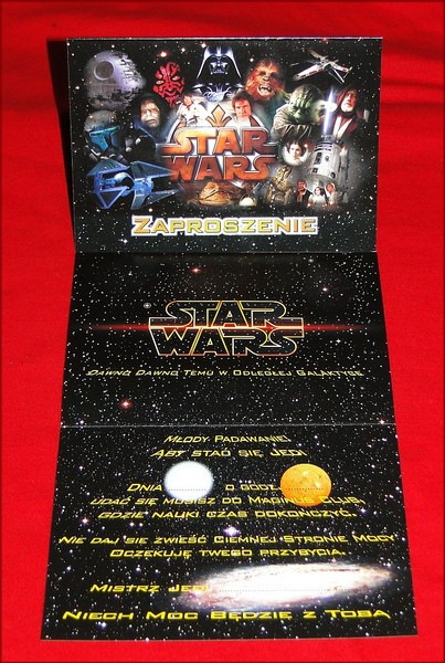 Dla urodzin Star Wars mamy specjalne zaproszenia. Zaproszenie składane, na ostatniej stronie znajduje się mapka ułatwiająca dojazd do naszego klubu. W środku zamieściliśmy spersonalizowany tekst, tak, aby nie trzeba dużo wypełniać. Wystarczy wpisać kogo się zaprasza oraz datę i godzinę rozpoczęcia urodzin. Cała reszta jest już wypełniona. Koszt zaproszenia - 1.5 zł